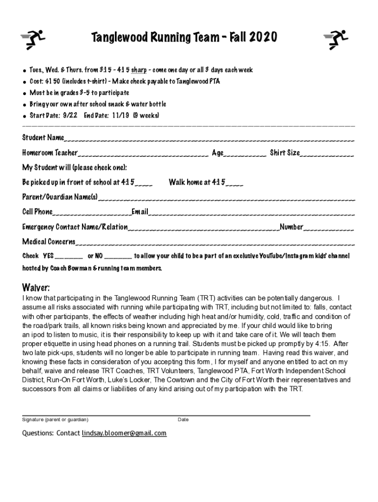 Tangle wood Running Team Fall 2020 Tues., Wed. & Thurs. From 3:15 4:15 sharp come one day or all 3 days each week Cost: $150 (includes shirt) Make check payable to Tangle wood PTA Must be in grades