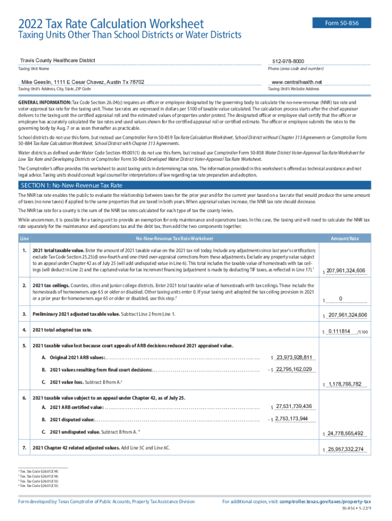 2022 Tax Rate Calculation WorksheetForm 50856Taxing Units Other Than School Districts or Water Districts Travis County Healthcare District ___5129788000 _Taxing Unit Name Mike Gremlin, 1111 E Cesar