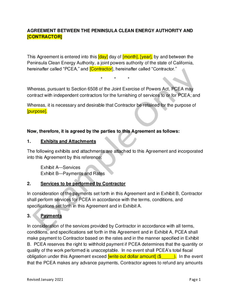 AGREEMENT BETWEEN THE PENINSULA CLEAN ENERGY AUTHORITY AND [CONTRACTOR]This Agreement is entered into this [day] day of [month], [year], by and between the Peninsula Clean Energy Authority, a joint