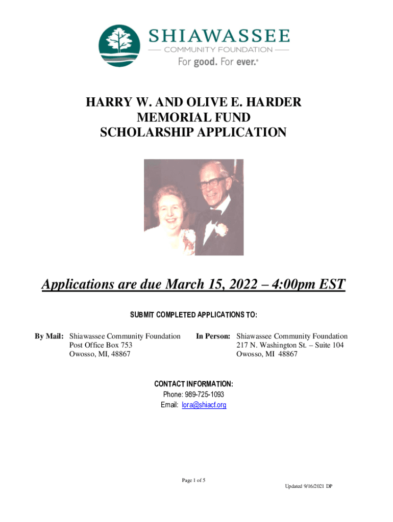 HARRY W. AND OLIVE E. HARDER MEMORIAL FUND SCHOLARSHIP APPLICATIONApplications are due March 15, 2022 4:00pm EST SUBMIT COMPLETED APPLICATIONS TO: By Mail: Shiawassee Community Foundation Post Office