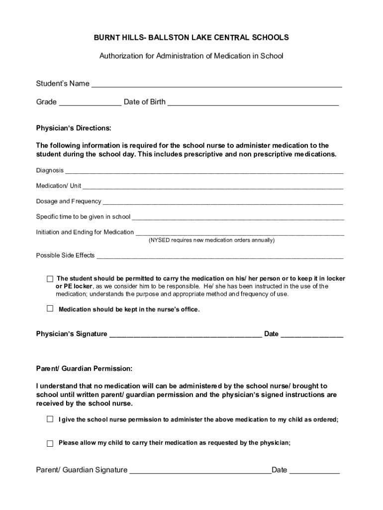 BURNT HILLS BALLSTON LAKE CENTRAL SCHOOLS Authorization for Administration of Medication in School Students Name ___ Grade ___ Date of Birth ___ Physicians Directions: The following information is