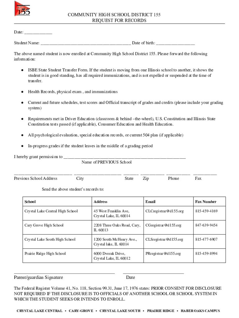 COMMUNITY HIGH SCHOOL DISTRICT 155 REQUEST FOR RECORDS Date: ___ Student Name: ___ Date of birth: ___ The above named student is now enrolled at Community High School District 155. Please forward