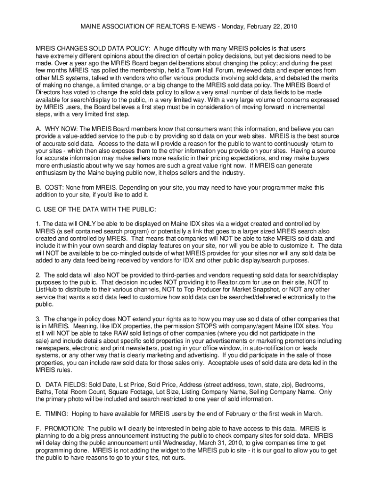 MAINE ASSOCIATION OF REALTORS NEWS Monday, February 22, 2010MREIS CHANGES SOLD DATA POLICY: A huge difficulty with many MR EIS policies is that users have extremely different opinions about the direction