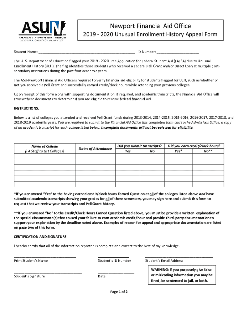 Newport Financial Aid Office 2019 2020 Unusual Enrollment History Appeal Form Student Name: ___ ID Number: ___ The U. S. Department of Education flagged your 2019 2020 Free Application for Federal