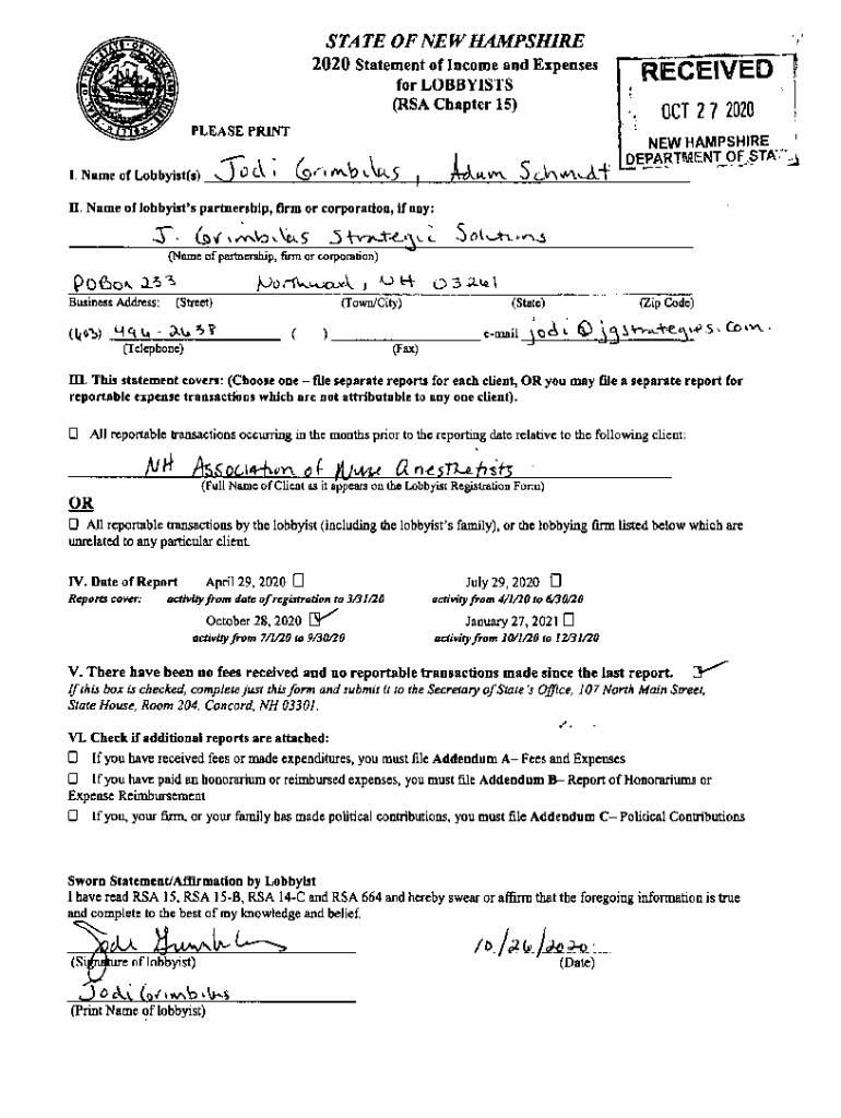 STATE OF NEW HAMPSHIRE2020 Statement of Income and ExpensesRECEIVEDfor LOBBYISTS(RSA Chapter 15).OCT 2 7 2020PLEASE PRINTED HAMPSHIRE. Name of Lobbyist(s)$ CV|n. Name of lobbyist\'s partnership, firm