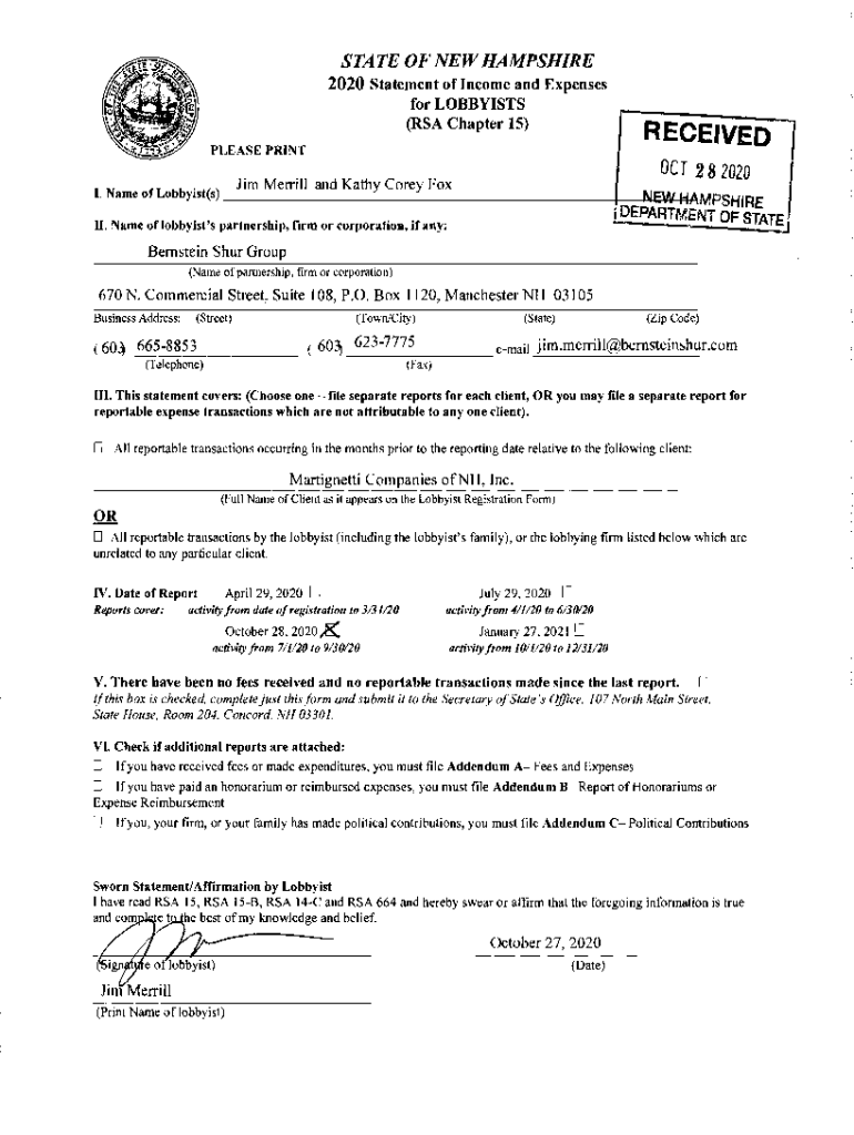 STATE OF NEW HAMPSHIRE 2020 Statement of Income and Expenses for LOBBYISTS (RSA Chapter 15)RECEIVEDPLEASE Printer 2 s 2020Jim Merrill and Kathy Corey Fox I. Name of Lobbyist(s) +\'\”\';.HAMPSHIRE