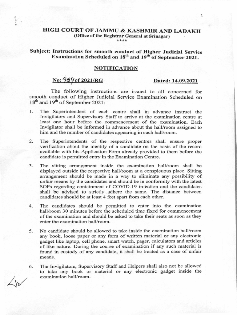 1HIGH COURT OF JAMMY & KASHMIR AND KAZAKH (Office of the Registrar General at Srinagar)Subject: Instructions for smooth conduct of Higher Judicial Service Examination Scheduled on 18th and 19th of