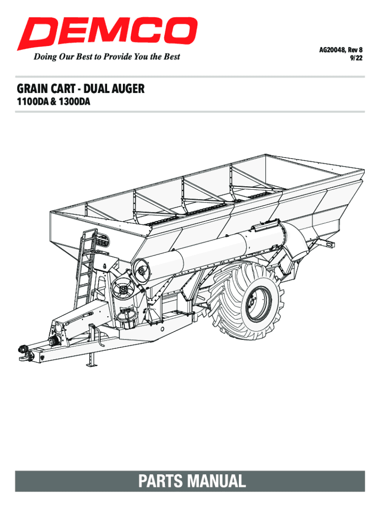AG20048, Rev 8 9/22GRAIN CART DUAL AUGER 1100DA & 1300DATable of Contents OverviewAxle AssemblyTable of Contents.............................................. 2 Grain Cart Information .....................................