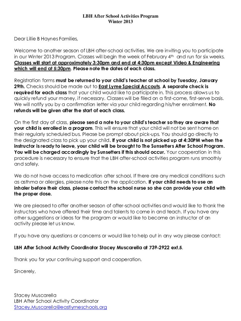 LB After School Activities Program Winter 2013 Dear Lillie B Haynes Families, Welcome to another season of LB after school activities. We are inviting you to participate in our Winter 2013 Program.