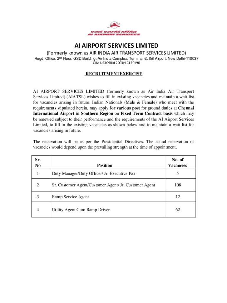 AI AIRPORT SERVICES LIMITED (Formerly known as AIR INDIA AIR TRANSPORT SERVICES LIMITED) Red. Office: 2nd Floor, GOD Building, Air India Complex, Terminal2, IGI Airport, New Delhi110037 IN: U63090DL2003PLC120790RECRUITMENTEXERCISEAI