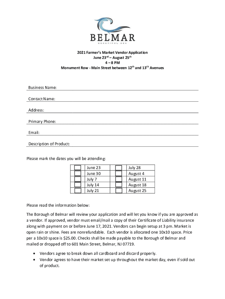 2021 Farmers Market Vendor Application June 23rd August 25th 4 8 PM Monument Row Main Street between 12th and 13th AvenuesBusiness Name: Contact Name: Address: Primary Phone: Email: Description of