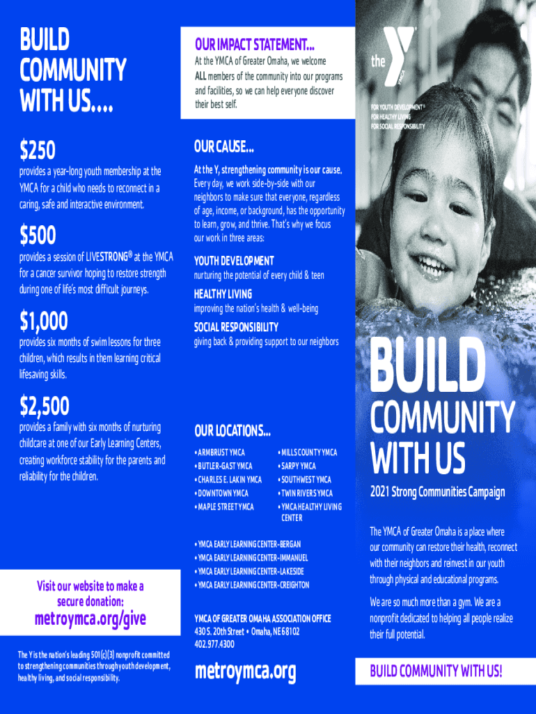 BUILD COMMUNITY WITH US. $250provides a yearlong youth membership at the YMCA for a child who needs to reconnect in a caring, safe and interactive environment.$500OUR IMPACT STATEMENT... At the YMCA