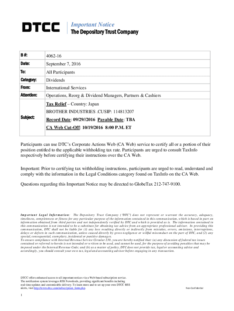 Important Notice The Depository Trust Company #:406216Date:September 7, 2016To:All ParticipantsCategory:DividendsFrom:International ServicesAttention:Operations, Reorg & Dividend Managers, Partners