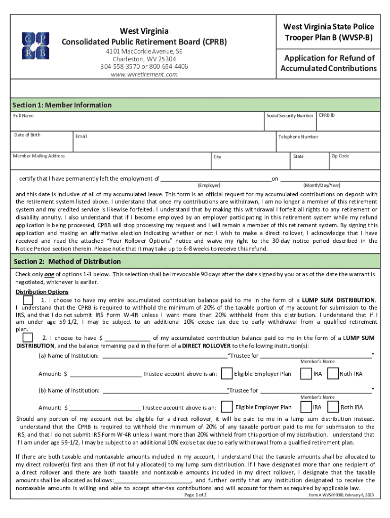 West Virginia Consolidated Public Retirement Board (CURB) West Virginia State Police Trooper Plan B (WV SPB)IMPORTANT NOTICE Attached is a WV SPB Application for Refund of Accumulated Contributions,