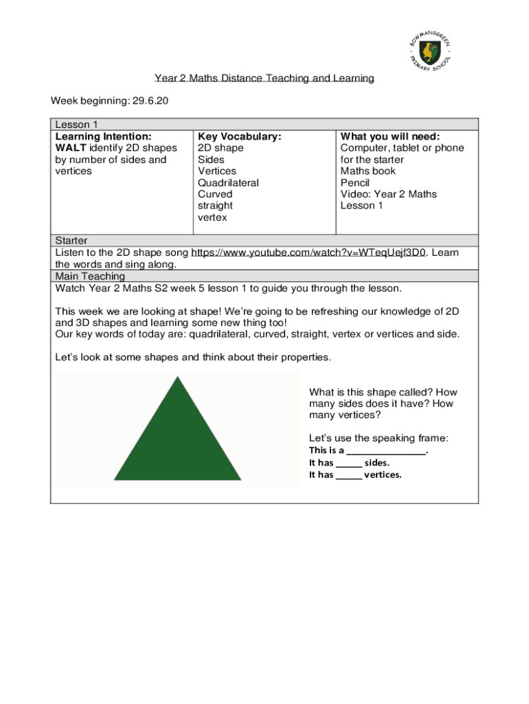 Get the free Year 2 - Week 8 - Count sides and vertices on 2D shapes on - bowmansgreen herts sch