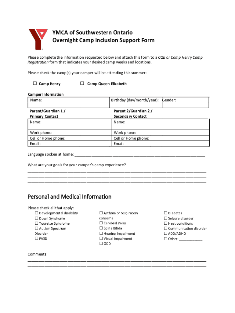YMCA of Southwestern Ontario Overnight Camp Inclusion Support Form Please complete the information requested below and attach this form to a CQE or Camp Henry Camp Registration form that indicates