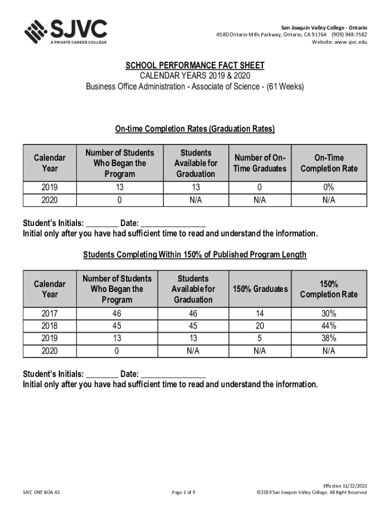 San Joaquin Valley College Ontario 4580 Ontario Mills Parkway, Ontario, CA 91764 (909) 9487582 Website: www.sjvc.eduSCHOOL PERFORMANCE FACT SHEET CALENDAR YEARS 2019 & 2020 Business Office Administration
