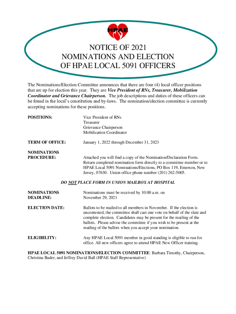 Get the free Notice of Nominations and Election of Local 5091 Officers