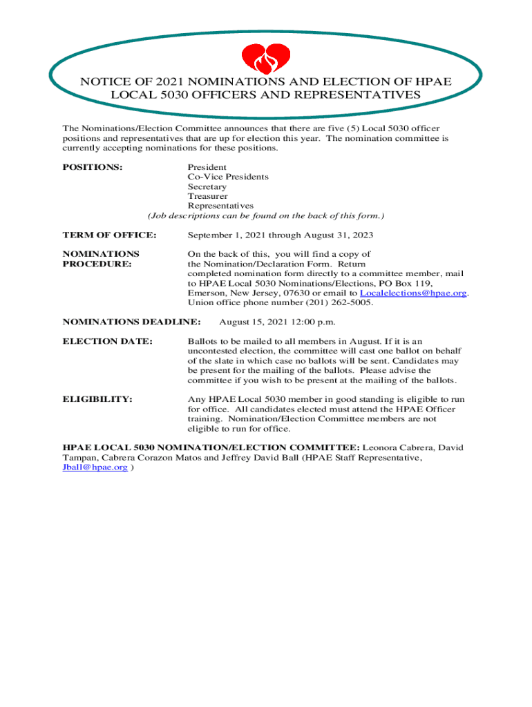 NOTICE OF 2021 NOMINATIONS AND ELECTION OF HAE LOCAL 5030 OFFICERS AND REPRESENTATIVES The Nominations/Election Committee announces that there are five (5) Local 5030 officer positions and representatives