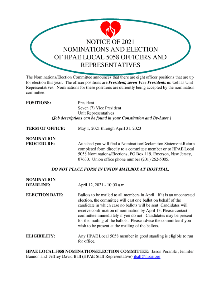 NOTICE OF 2021 NOMINATIONS AND ELECTION OF HAE LOCAL 5058 OFFICERS AND REPRESENTATIVES The Nominations/Election Committee announces that there are eight officer positions that are up for election