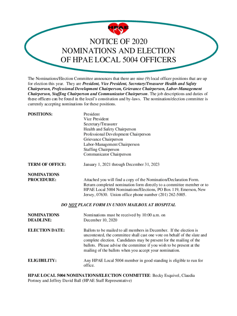 NOTICE OF 2020 NOMINATIONS AND ELECTION OF HAE LOCAL 5004 OFFICERS The Nominations/Election Committee announces that there are nine (9) local officer positions that are up for election this year.
