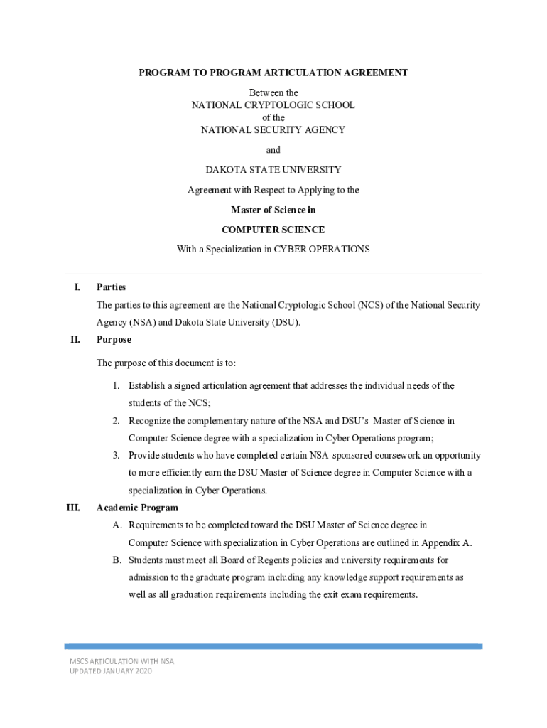 PROGRAM TO PROGRAM ARTICULATION AGREEMENT Between the NATIONAL CRYPTOLOGIC SCHOOL of the NATIONAL SECURITY AGENCY and DAKOTA STATE UNIVERSITY Agreement with Respect to Applying to the Master of Science