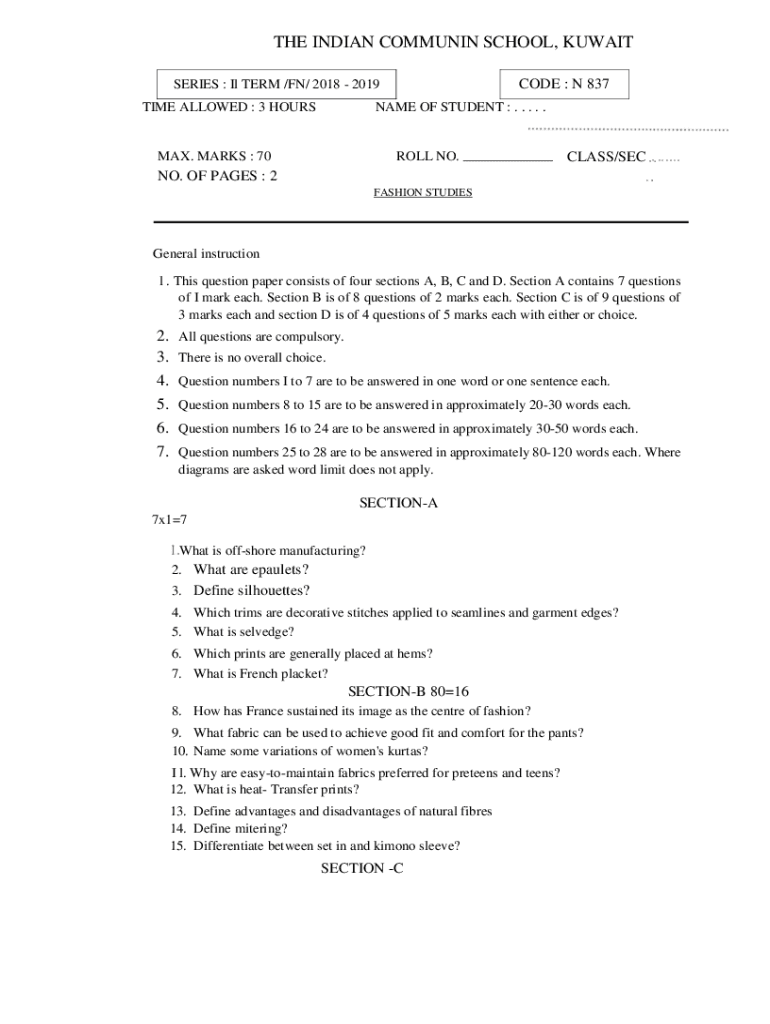 THE INDIAN COMMUNION SCHOOL, KUWAIT CODE : N 837SERIES : IL TERM /FN/ 2018 2019 TIME ALLOWED : 3 Surnames OF STUDENT :. . . . .ROLL NO.MAX. MARKS : 70CLASS/SE CNO. OF PAGES : 2 FASHION STUDIESGeneral
