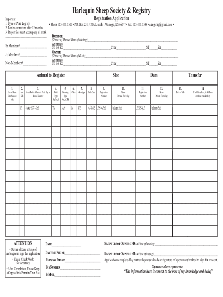 Harlequin Sheep Society & RegistryRegistration Application Important 1. Type or Print Legibly Phone 7854568500 P.O. Box 231, 420A Lincoln Cameo, KS 66547 Fax: 7854568599 asregistry@gmail.com 2. Lambs