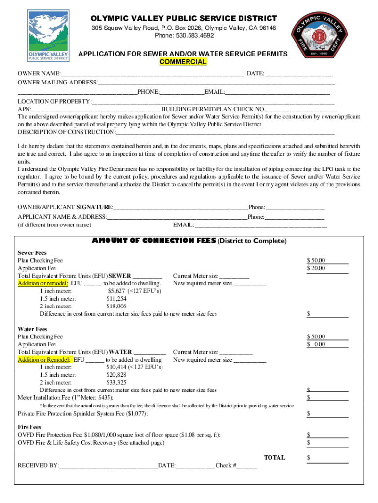 OLYMPIC VALLEY PUBLIC SERVICE DISTRICT 305 Squaw Valley Road, P.O. Box 2026, Olympic Valley, CA 96146 Phone: 530.583.4692APPLICATION FOR SEWER AND/OR WATER SERVICE PERMITS COMMERCIAL OWNER NAME:___