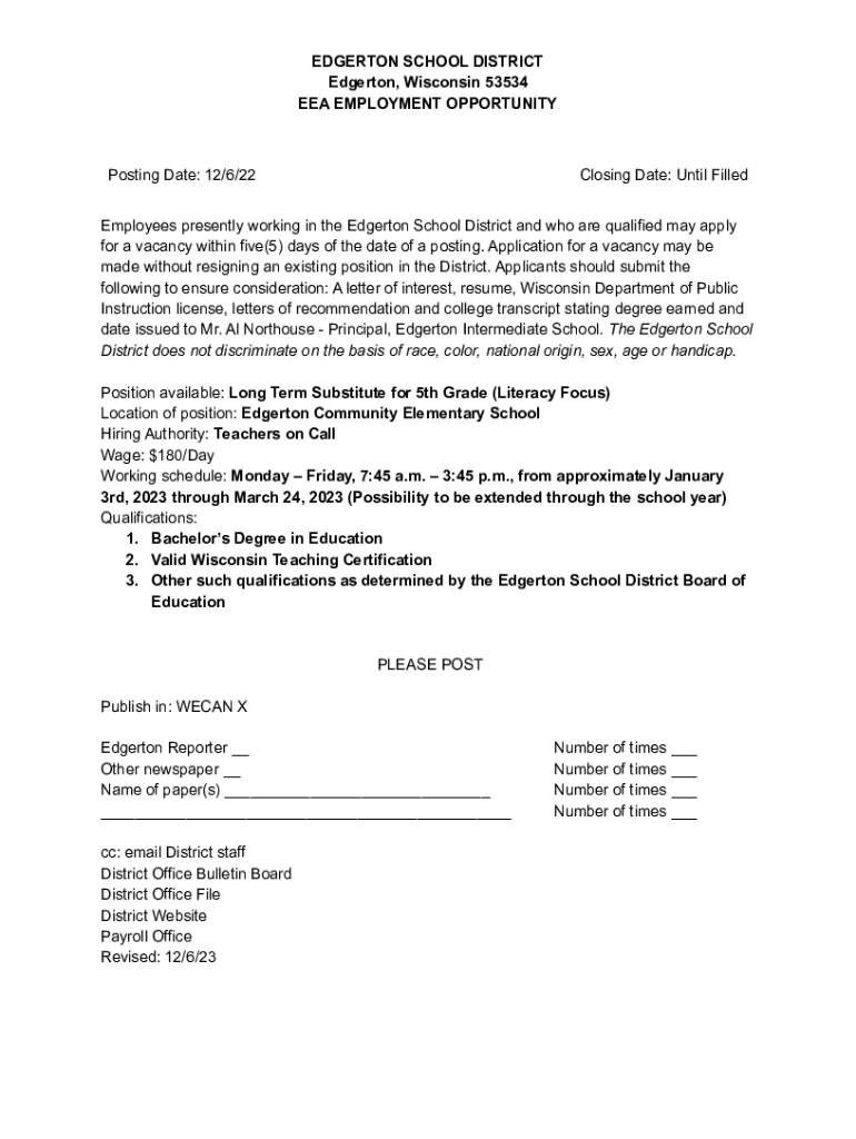 EEA EMPLOYMENT OPPORTUNITYPosting Date: 12/6/22Closing Date: Until FilledEmployees presently working in the Edgerton School District and who are