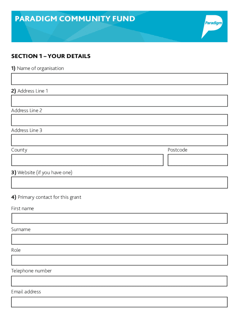 PARADIGM COMMUNITY FUNCTION 1 YOUR DETAILS 1) Name of organisation2) Address Line 1Address Line 2Address Line 3County3) Website (if you have one)4) Primary contact for this grant First nameSurnameRoleTelephone