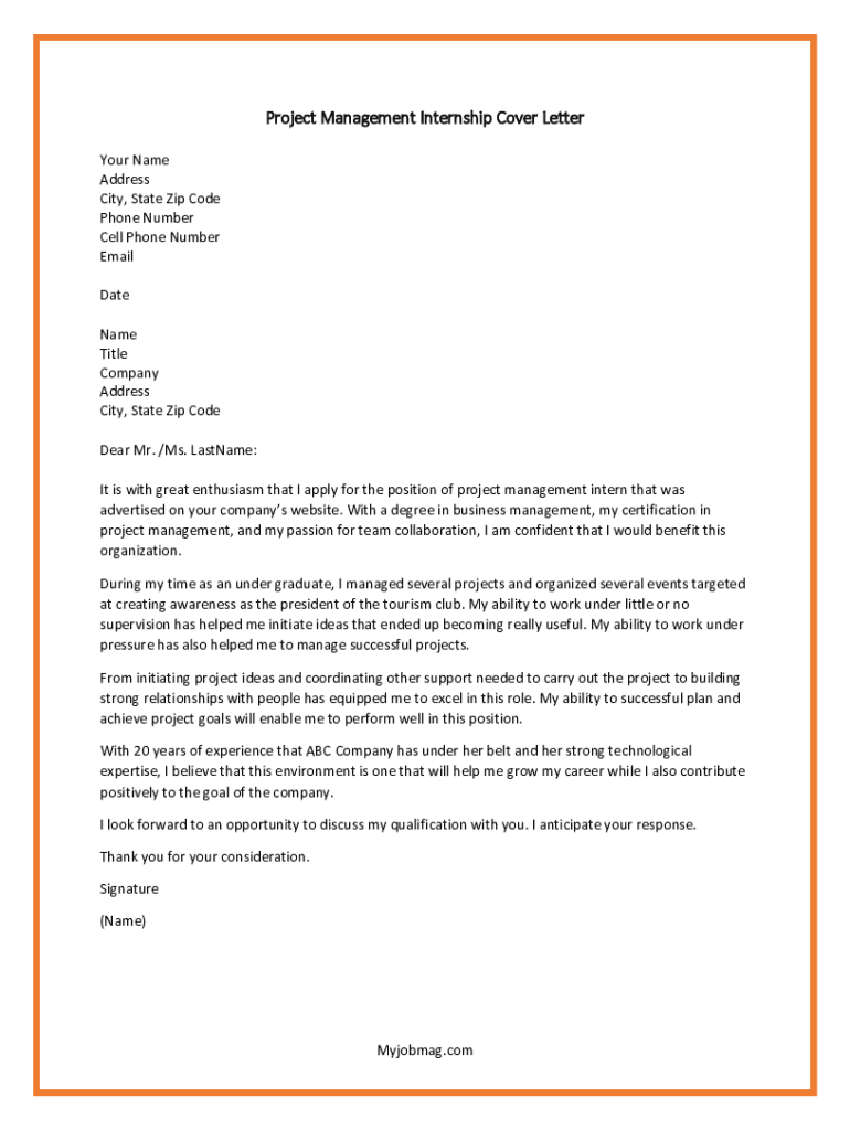 Project Management Internship Cover Letter Your Name Address City, State Zip Code Phone Number Cell Phone Number Email Date Name Title Company Address City, State Zip Code Dear Mr. /Ms. Hostname: