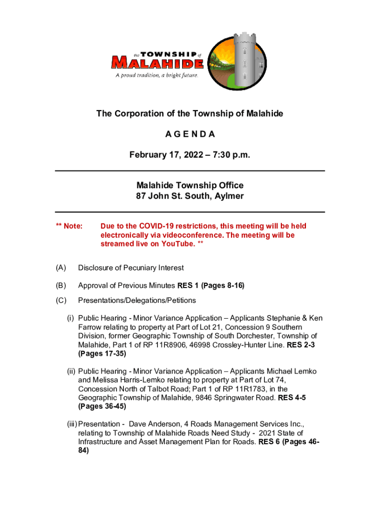 The Corporation of the Township of Malaise AGENDA February 17, 2022 7:30 p.m. Malaise Township Office 87 John St. South, Aylmer ** Note:Due to the COVID-19 restrictions, this meeting will be held