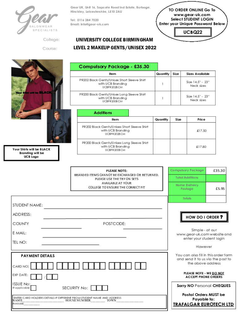 Gear UK, Unit 16, Sap cote Road Ind Estate, Burbage, Hinckley, Leicestershire, LE10 2AUTO ORDER ONLINE Go To www.gearuk.com Select STUDENT LOGIN Enter your Unique Password Below: 0116 284 7020 Email: