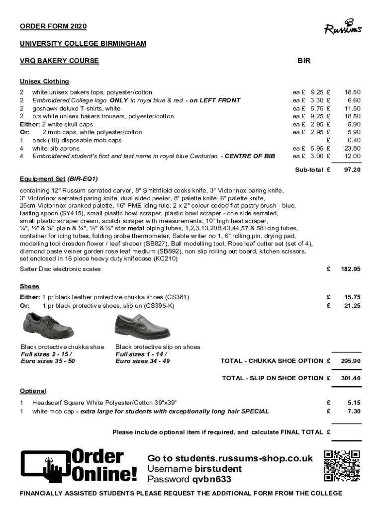 ORDER FORM 2020 UNIVERSITY COLLEGE BIRMINGHAMBIRVRQ BAKERY COURSE Unisex Clothing 2 white unisex bakers tops, polyester/cotton 2 Embroidered College logos ONLY in royal blue & red on LEFT FRONT 2