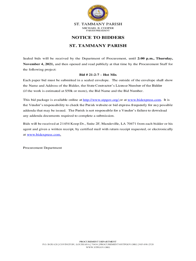ST. TAMMANY PARISH MICHAEL B. COOPER PARISH PRESIDENTNOTICE TO BIDDERS ST. TAMMANY PARISH Sealed bids will be received by the Department of Procurement, until 2:00 p.m., Thursday, November 4, 2021,
