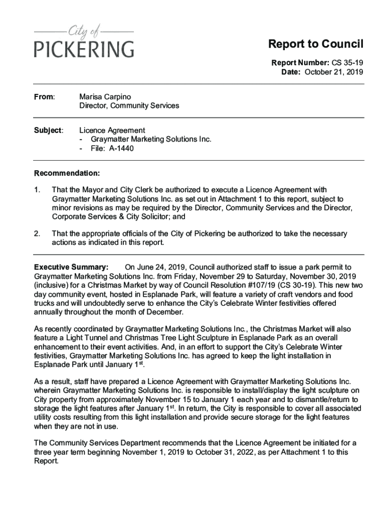 Report to Council Report Number: CS 3519 Date: October 21, 2019, From:Marisa Carping Director, Community ServicesSubject:License Agreement Gray matter Marketing Solutions Inc. File: A1440Recommendation:
