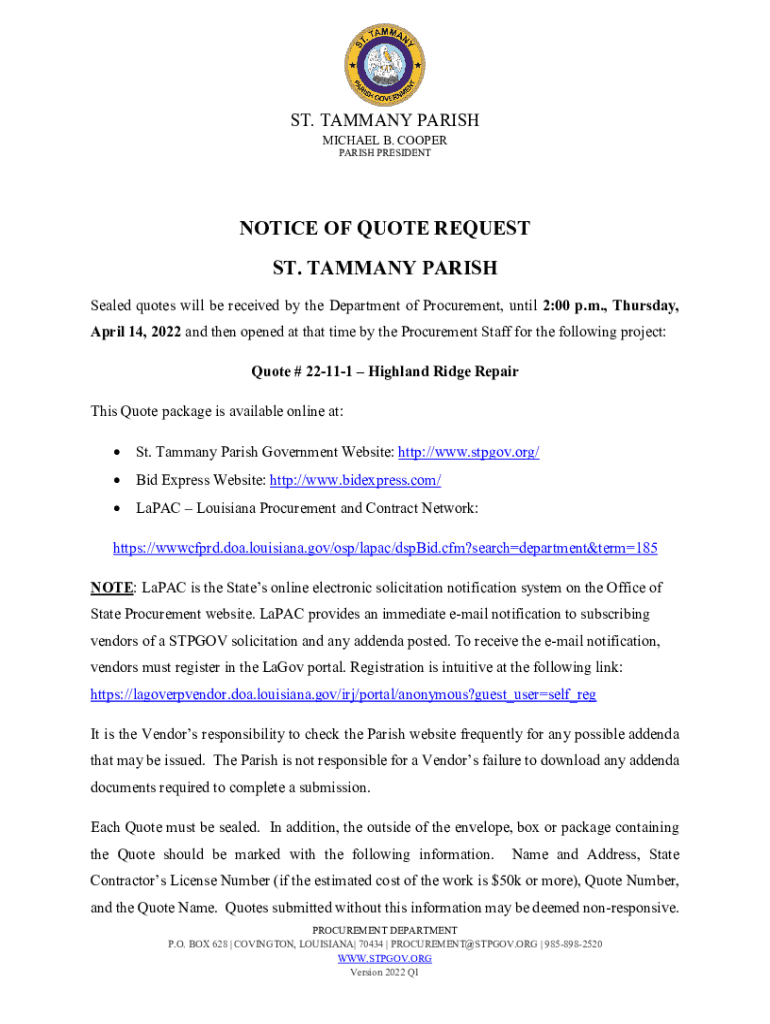 ST. TAMMANY PARISH MICHAEL B. COOPER PARISH PRESIDENTNOTICE OF QUOTE REQUEST ST. TAMMANY PARISH Sealed quotes will be received by the Department of Procurement, until 2:00 p.m., Thursday, April 14,
