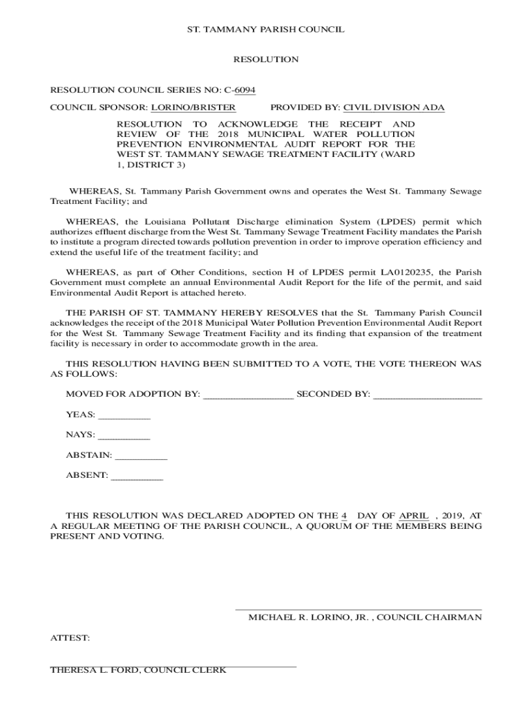 ST. TAMMANY PARISH COUNCILRESOLUTIONRESOLUTION COUNCIL SERIES NO: C6094 COUNCIL SPONSOR: TORINO/BRISTERPROVIDED BY: CIVIL DIVISION RESOLUTION TO ACKNOWLEDGE THE RECEIPT AND REVIEW OF THE 2018 MUNICIPAL