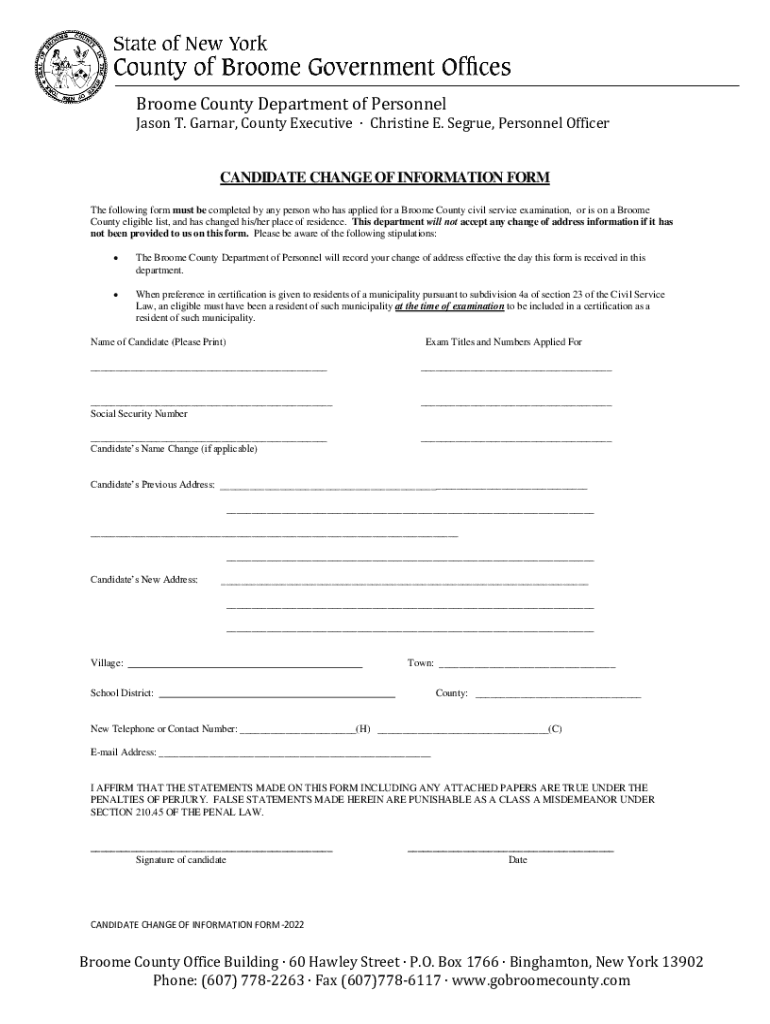 Brooke County Department of Personnel Jason T. Garner, County Executive Christine E. Segue, Personnel OfficerCANDIDATE CHANGE OF INFORMATION From The following form must be completed by any person