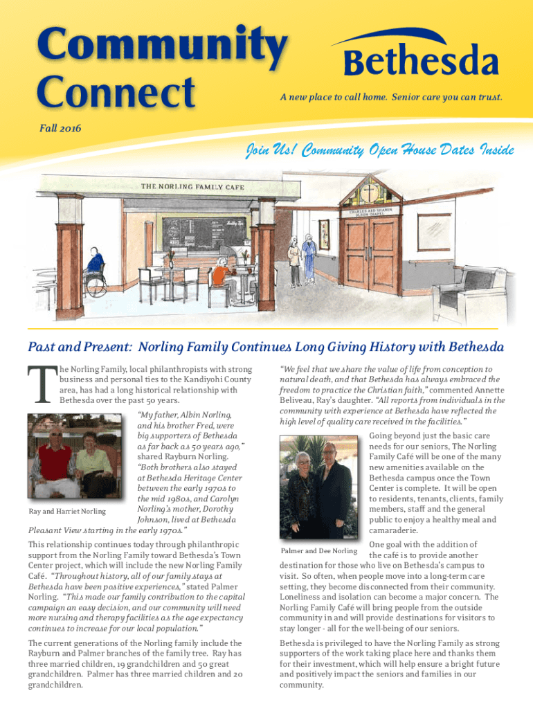 Community Connect Anew place to call home. Senior care you can trust. Fall 2016Join Us! Community Open House Dates Insiders and Present: Nor long Family Continues Long Giving History with Bethesda