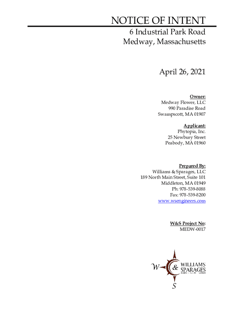 NOTICE OF INTENT 6 Industrial Park Road Midway, Massachusetts April 26, 2021, Owner: Midway Flower, LLC 990 Paradise Road Swampscott, MA 01907 Applicant: Pretoria, Inc. 25 Newbury Street Peabody,