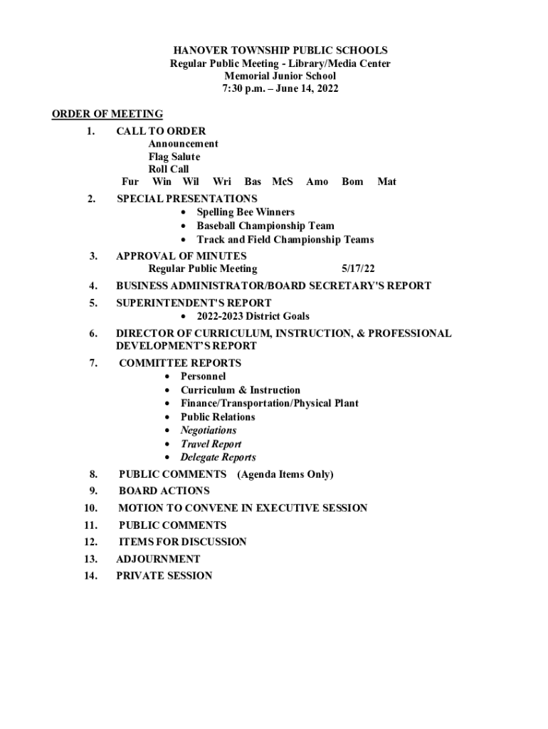 HANOVER TOWNSHIP PUBLIC SCHOOLS Regular Public Meeting Library/Media Center Memorial Junior School 7:30 p.m. June 14, 2022, ORDER OF MEETING 1.CALL TO ORDER Announcement Flag Salute Roll Call Fur