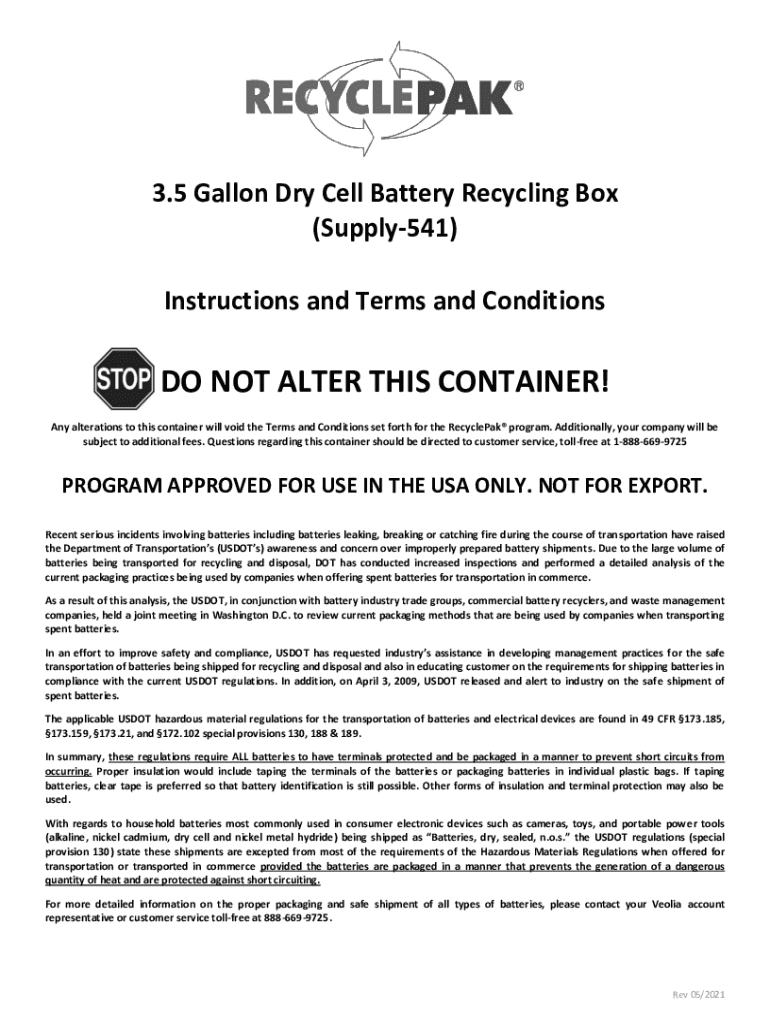 3.5 Gallon Dry Cell Battery Recycling Box (Supply541) Instructions and Terms and Conditions DO NOT ALTER THIS CONTAINER! Any alterations to this container will void the Terms and Conditions set forth