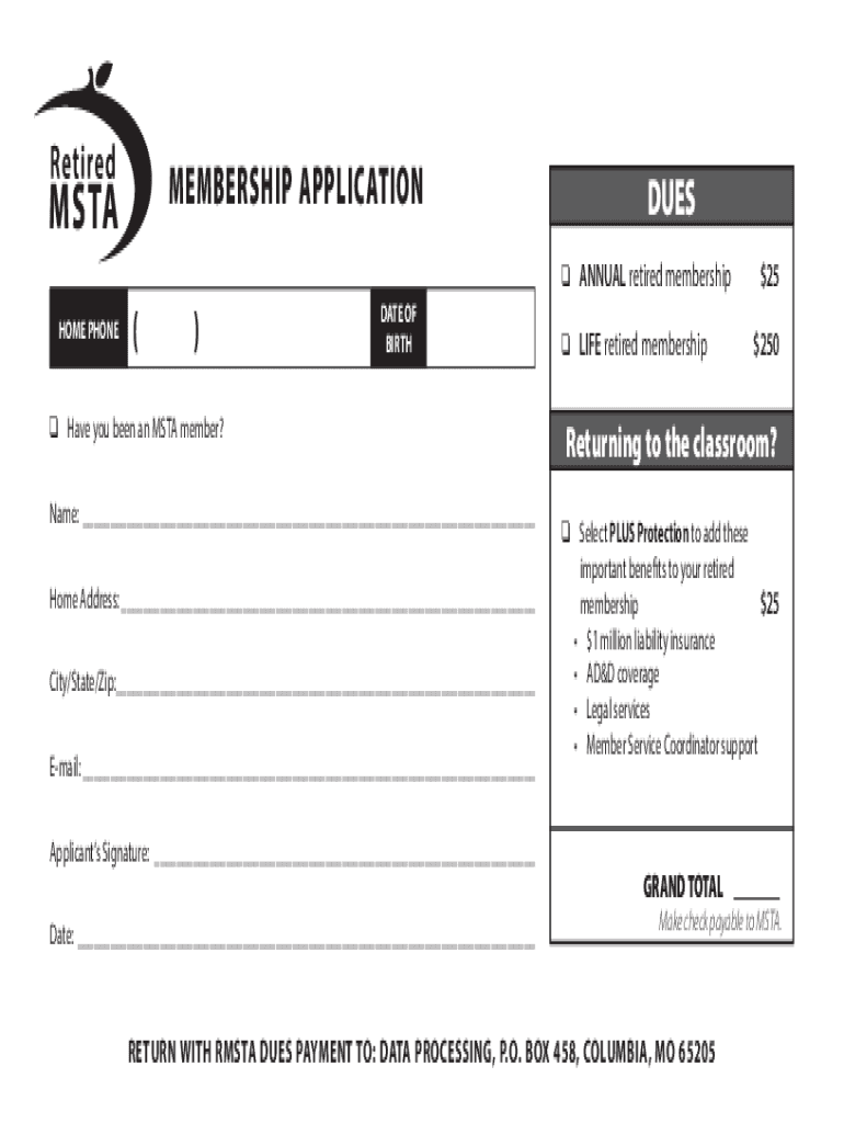 MEMBERSHIP APPLICATIONS q ANNUAL retired membership $25HOME PHONE()DATE OF Birth LIFE retired membership $250q Have you been an MTA member? Name:___ Home Address:___ City/State/Zip:___ Email:___Returning