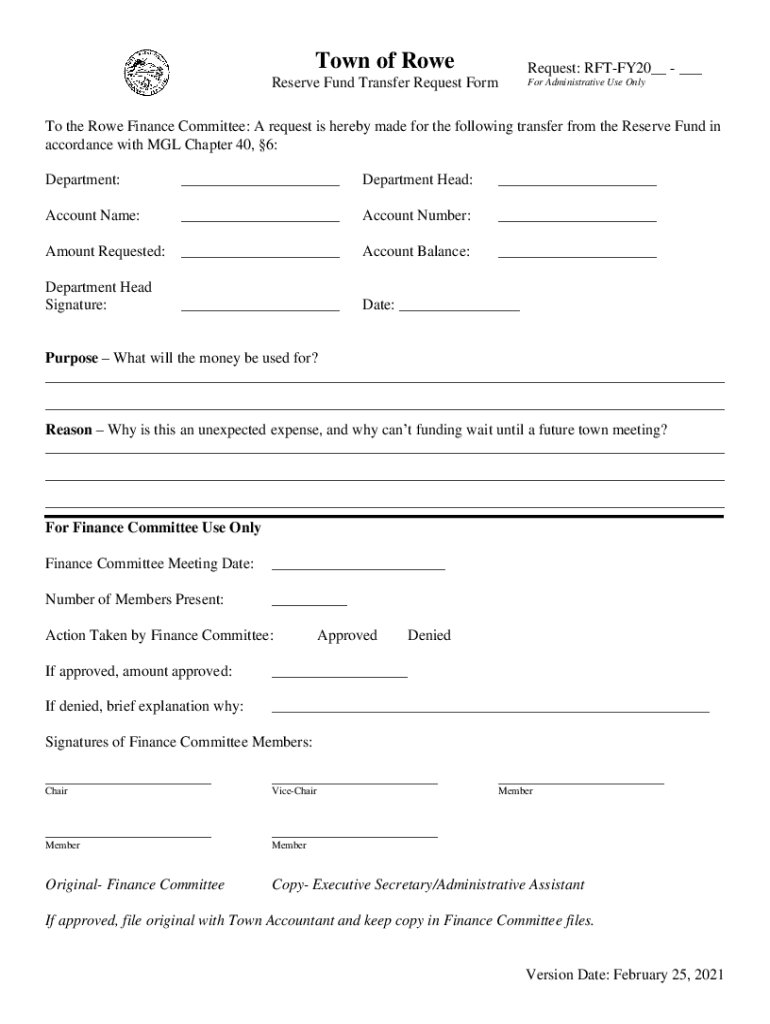 Town of RoweRequest: RFTFY20__ ___Reserve Fund Transfer Request Former Administrative Use Only the Rowe Finance Committee: A request is hereby made for the following transfer from the Reserve Fund