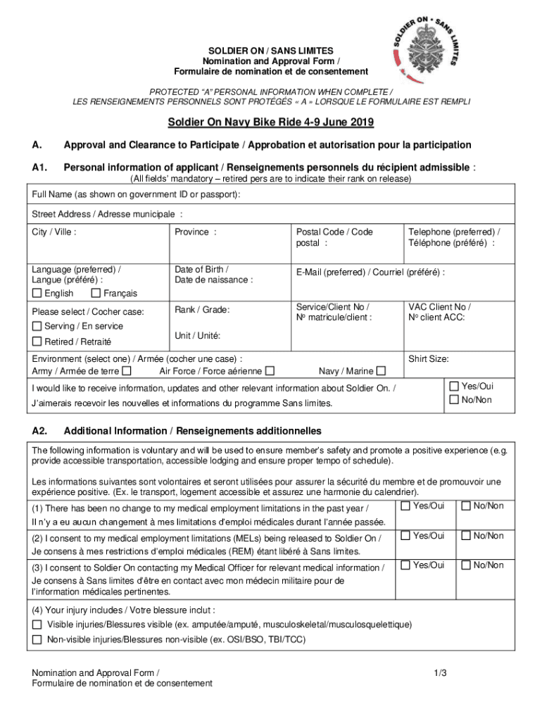 SOLDIER ON / SANS LIMITED Nomination and Approval Form / Formula ire DE nomination et de contentment PROTECTED PERSONAL INFORMATION WHEN COMPLETE / LES REASSIGNMENTS PERSONNEL SENT PRONGS A MOSQUE