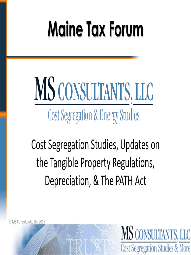 Maine Tax Foremost Segregation Studies, Updates on the Tangible Property Regulations, Depreciation, & The PATH Act MS Consultants, LLC 2016David A. Fabian Director, MS Consultants LLC dfabian@costsegs.com