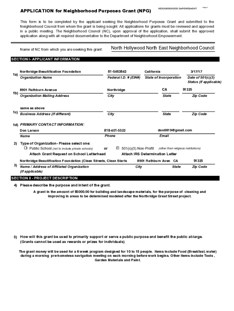 Neighborhood Council Funding Program APPLICATION for Neighborhood Purposes Grant (NPG) This form is to be completed by the applicant seeking the Neighborhood Purposes Grant and submitted to the Neighborhood