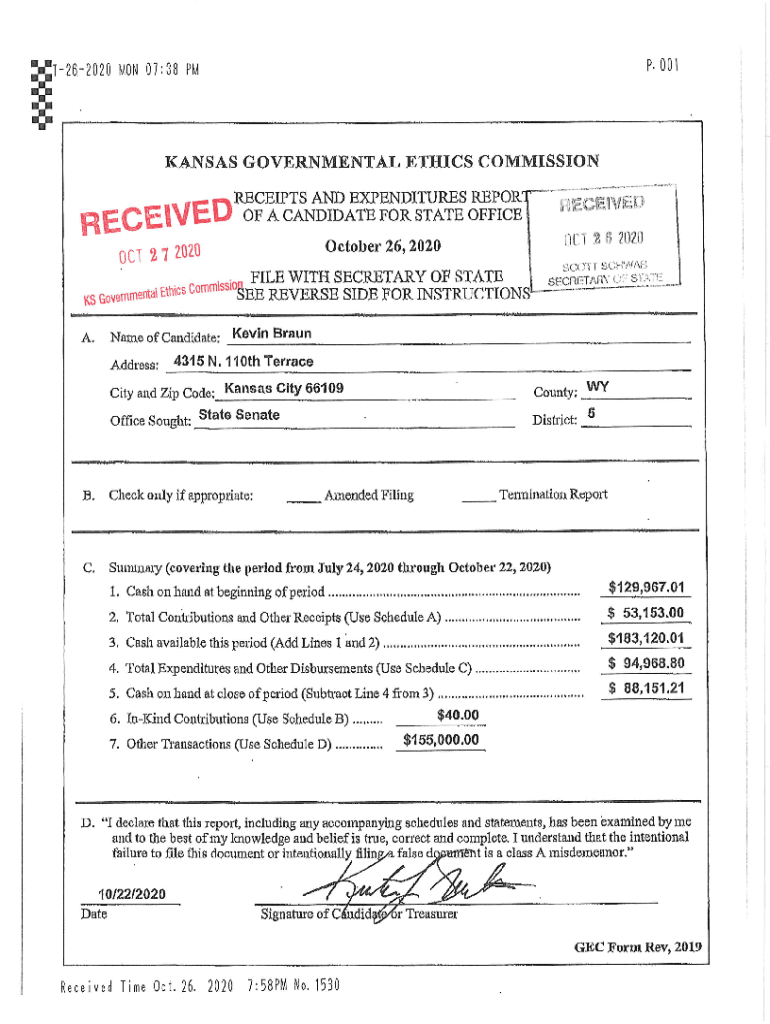 P, 001:T26.2020 MON 0?;38 KANSAS GOVERNMENTAL ETHICS COMMISSION.RECEIPTS AND EXPENDITURES REPORT;, in, ?OF A CANDIDATE FOR STATE OFFICE |no % ?? ?o?of ^020 October 26, 2020, KGO\'women\'SCIFI I of:\'^\'^\'FILE